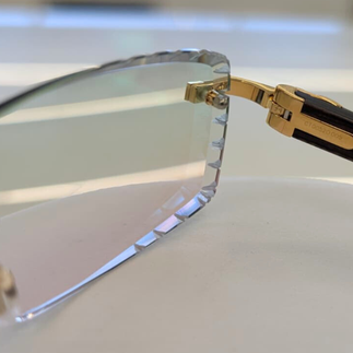 What truly sets this pair apart is the lens finishing. We’ve created a custom lens shape, perfectly aligned to the minimalist Cartier frame, then enhanced it with faceted edges and precision diamond cuts. These details catch the light from every angle, creating a jewellery-like effect that mirrors Cartier’s heritage in fine craftsmanship.